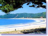 青野川の河口の東側、青い松を背にして大きく弓なりにそった真っ白の砂浜が続いています。女性的な美しさを持つ弓ケ浜海水浴場です。岩ひとつない景観とおだやかな波で有名な弓ケ浜は、夏には多くの海水浴客でにぎわいます。 左右を岬に挟まれた波静かな海岸。弓形に湾曲した1.2kmの白砂も浜は遠浅で浜の両脇には、磯遊びのできるポイントがあり、素潜りや釣りも楽しめます。毎年十数万人の海水浴客が訪れ、日本有数の海水浴場です。 ”日本の渚百選”にも選ばれる美しい海浜 毎年8月8日夜8時からは、弓ヶ浜花火大会が開かれます。